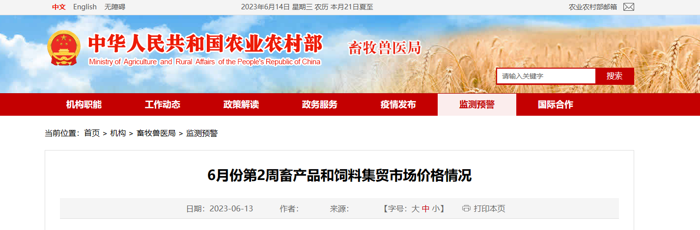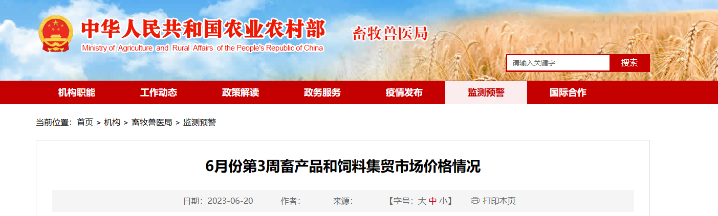 據(jù)對(duì)全國500個(gè)縣集貿(mào)市場(chǎng)和采集點(diǎn)的監(jiān)測(cè),6月份第3周(采集日為6月14日)玉米價(jià)格上漲,生豬產(chǎn)品、家禽產(chǎn)品、牛羊產(chǎn)品、豆粕、肉雞配合飼料價(jià)格下跌,豬配合飼料、蛋雞配合飼料價(jià)格持平。生豬產(chǎn)品價(jià)格。全國...
