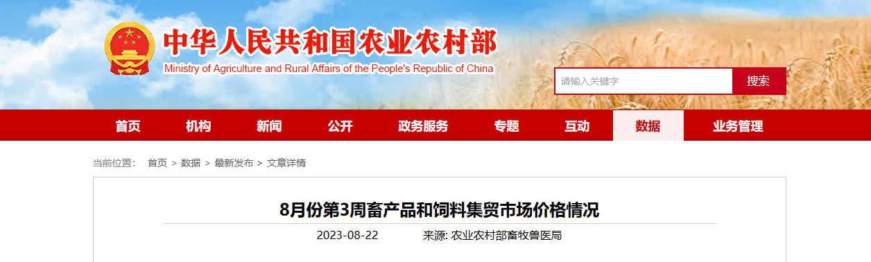 據(jù)對(duì)全國500個(gè)縣集貿(mào)市場和采集點(diǎn)的監(jiān)測,8月份第4周(采集日為8月23日)生豬產(chǎn)品、雞蛋、雞肉、商品代蛋雛雞、牛肉、生鮮乳、飼料價(jià)格環(huán)比上漲,商品代肉雛雞價(jià)格下跌,羊肉價(jià)格基本持平。 ...